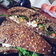 Spread cream cheese on the bun, add tuna, place onion rings, tomato slices, and finely chopped boiled egg, add the salad mix and drizzle with balsamic vinegar.