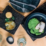 Green Pea Puree: (for 1 serving) Blanch 200 g of fresh or frozen peas (dip in boiling water for a couple of minutes and then immediately into ice water) in a small amount of water. Drain the water and add 50 ml of cream to the peas, bringing it to a boil. Season with salt and blend until smooth. It is better to strain the finished puree through a sieve for a fluffier texture.