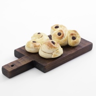 Lightly beat the egg with a fork and brush it over the rolls. Decorate the rolls with raisins and place them in an oven preheated to 392°F for 15 minutes.