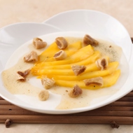 Arrange the mango on the mousse, drizzle with syrup, garnish with pieces of fig, and serve immediately.