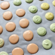 Continue whipping until the egg whites cool down. Gradually add the almond flour with the powdered sugar. Gently mix until homogeneous. Divide the batter into different bowls and add various food colorings.