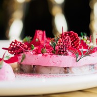 Beetroot cream: Blend cooked beetroot (50 g) with hard-boiled eggs and mayonnaise using an immersion blender. Add diced apple and grainy mustard. Season to taste with salt. Transfer the mixture into a piping bag.