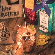Pour ginger lemonade and tamarind juice over the ice. Add pieces of ginger and a star anise.
