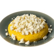 The proper mamaliga should take the shape of the pot. Serve it with brinza cheese.