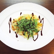 Arrange the sliced mango on top of the fish. Then, add a handful of arugula and drizzle the salad with reduced balsamic vinegar.