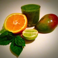Place the mango, basil leaves with stems, lime and orange juices, and spinach leaves in a blender (if you're not particularly fond of spinach, you can skip it, but it gives the smoothie an amazing green color that immediately suggests spring is coming).