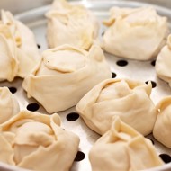 Place the prepared manti on greased racks (kaskans), place them over a pot of boiling water or broth, and steam for 25–30 minutes. The finished manti can be served with spicy sauce, sour cream, or melted butter.
