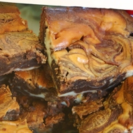 Pour 3/4 of the chocolate batter into the prepared dish. Then add the cream cheese mixture. Layer the chocolate and cream mixtures, then swirl them together to create a marbled surface. Bake for 30–40 minutes. Serve chilled.