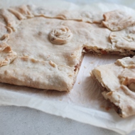 Pinch the seams and place it in an oven preheated to 356°F. Bake for 20–25 minutes. When the pie is ready, it’s important to let it cool on a special rack or at least on something wooden. Otherwise, the bottom crust will lose its crispiness, which is one of the main delights of this pie.