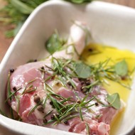 In a bowl, mix the olive oil, finely chopped rosemary, finely chopped thyme, minced garlic, vinegar, and a little black pepper.