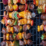 Cut the onion, pepper, zucchini, and mushrooms into small pieces and, alternating with the meat, thread them onto skewers, brush with the marinade, and grill, turning until the meat is cooked through.