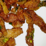 Heat frying oil in a deep skillet. Fry the pork until golden brown. Remove to paper towels and set aside.