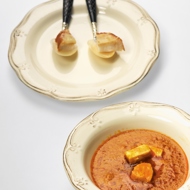 Sauté pieces of baguette in butter. Sprinkle with grated Gruyère cheese and place in the oven preheated to 392°F for three minutes. Serve the soup with the toasted bread.