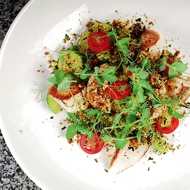 Gently warm the asparagus and zucchini in olive oil — do not fry, just warm them. Arrange the vegetables on a plate, topped with scallops and slices of tomato. Drizzle the salad with lemon juice, generously sprinkle with a mixture of Japanese spices called 'Furikake', and garnish with pea shoots.