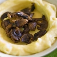 When serving the mashed potatoes, sprinkle each portion on the plate with the mushrooms and onions (I personally just mix the sautéed mushrooms and onions with the mashed potatoes, but as experience has shown — not everyone likes mushrooms).