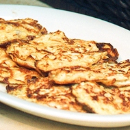 After ten minutes, without stirring the contents of the bowl, you can start frying the pancakes. It’s convenient to use a tablespoon to scoop the softened matzah and pour it onto a well-heated skillet coated with vegetable oil. Each tablespoon holds enough matzah for one pancake. The batter sets quickly, so you only need to fry each side for a few seconds.