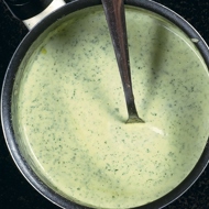 Stir in a little water into the mayonnaise — depending on how thick the mayonnaise turned out, you may need different amounts of liquid. The result should be a pourable consistency. Mix in the basil and season with salt to taste.