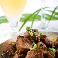 Do not salt the meat. Sear the meat over high heat on both sides until a golden crust forms. Then transfer the meat to a pot, sprinkle with coarsely chopped onion and allspice, add a bay leaf, pour in a full bottle of beer, and simmer on low heat for 10-20 minutes. After that, serve it on a plate with boiled potatoes, drizzling with the resulting sauce. Garnish with green peas.