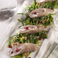 Slice the roll diagonally and place it on a bed of spelt and spinach.