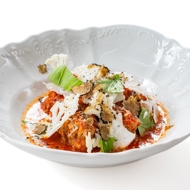 For the sauce, chop the onion, carrot, celery, and garlic randomly and sauté them lightly in olive oil. Then add the peeled tomatoes, vegetable broth, a sprig of basil, thyme, and rosemary, sugar, and 6 g of salt. Bring to a boil and simmer for 30 minutes over low heat. Pass the sauce through a meat grinder or a food mill. In a separate saucepan, heat a portion of the tomato sauce over low heat.