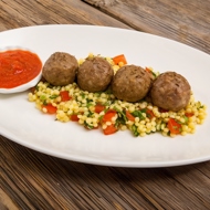 Place the meatballs on the ptitim, sprinkle with cumin, and serve with homemade adjika.