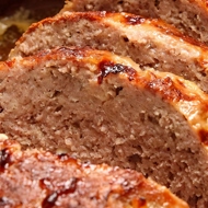 Transfer the mixture to the pan and press it down lightly. Smooth the top and bake for 1 hour and 10 minutes, or until cooked through. Insert a fork or metal skewer into the center of the loaf, leave it for 3 seconds, then touch it immediately. If the fork is very hot, it's done; if not, cook for a little longer. Let it rest for 5 minutes, then invert the pan onto a plate. Slice and drizzle with the juices from the pan.