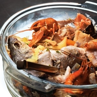 After that, immerse the fish in the pot with the broth and cook it for ten minutes. Next, add the crayfish, shrimp, a pinch of saffron, squeeze in the lemon juice, season with salt and pepper, and cook for another two to three minutes once the soup comes to a boil again.
