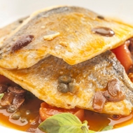 In a baking pouch, place the sea bream fillets, drizzle with Napoli sauce, sprinkle with olives, and pour in the wine and fish broth. Season with salt and pepper.