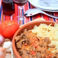 Continue to simmer on low heat for another twenty minutes. It turns out to be somewhat similar to beef stroganoff, but a bit thicker. The technology is the same. By the way, in Georgia, there are many different cafes that prepare beef stroganoff. They even add wine, just like in kharcho — it turns out incredibly delicious.