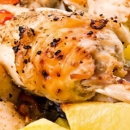 Serve the chicken in this sauce. Garnish with eggplants, tomatoes, and pre-fried potatoes.