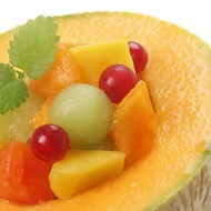 Cut the melon in half, remove the seeds, and carefully scoop out the flesh without damaging the skin. Cut it into small cubes.
