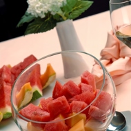 Mix the grenadine and orange juice. Drizzle lightly over the melons.