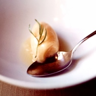 Before serving, chill the serving dish, place a tablespoon of granita in the center, and add a scoop of sorbet on top. Garnish with a sprig of tarragon or mint.
