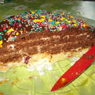 For the sponge cake: Mix 2 cups of sour cream (400 g), 2 eggs, 2 cups of sugar, 1.5 teaspoons of baking soda, and 2 cups of flour. Divide the batter into 2 parts, adding 2 tablespoons of cocoa to one part. Bake at 392°F for about 20–25 minutes. Optionally, you can add berries or walnuts to the batter.