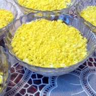 Layer the ingredients, starting with the chicken fillet and finishing with the yolks. Don't forget to add mayonnaise between the layers.