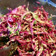 Shred the cabbage and chop the red onion. Place them in a bowl and season with the prepared dressing. Add salt and pepper to taste. Sprinkle with chopped cilantro.