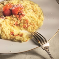 Pour in one-third of the broth, add the white wine, and cook the rice, stirring constantly. Once the broth comes to a boil, reduce the heat so that the liquid is just simmering. Continue to cook, stirring and adding more broth as needed. After five minutes, stir in the saffron infusion and keep up the stirring and adding of broth.