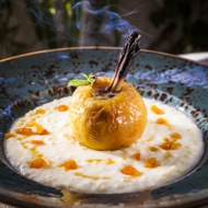 While the millet is cooking, bake the apple. To do this, remove the core, leaving the bottom intact. Fill the center with honey and place a cinnamon stick inside. Bake in the oven for 10 minutes at 392°F.