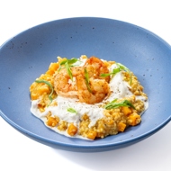Serve the millet risotto with pumpkin and shrimp immediately, garnished with stracciatella and tarragon leaves.
