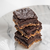 Melt the chocolate with milk in the microwave or in a double boiler, mix it with cocoa, and pour it over the caramel.