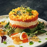 Garnish the top with grated egg yolk. You can also decorate with red caviar, quail eggs, lightly salted trout, or fresh herbs. Season with salt and pepper to taste.