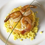 Carefully remove the ring from the salad, garnish with sautéed shrimp, and serve.