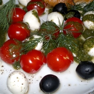 Arrange the tomatoes, olives, and mozzarella on a plate, drizzle with the sauce, and garnish with herbs.