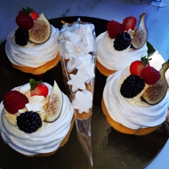Whip the egg whites with powdered sugar (50 g) until stiff peaks form. Add lemon juice. Add a pinch of salt and cornstarch. Transfer to a piping bag and pipe rings of desired size. Place them to dry in a preheated oven at 194°F for 3 hours. Do not open the oven. Next, place the chopped berries in the center of each meringue.