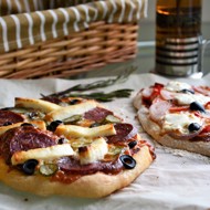 Layer the toppings thinly. For the first pizza: tomatoes, red onion, olives, chili pepper, cream cheese. For the second pizza: sausage, pickles, feta cheese, olives.