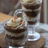Assemble the dessert by layering the cake and cream alternately. Optionally, sprinkle with chocolate crumbs.