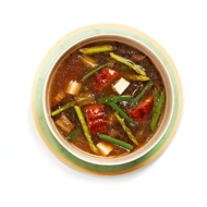 Mix the miso paste with the vegetables, then after a minute, pour in the broth and soy sauce. Add the seaweed (wakame or tosaka) to the soup and cook everything together for three minutes. Add thin slices of eel and bring the soup to a boil again. Serve with chopped green onions and toasted sesame seeds.