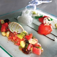 Feta Cheese Jelly (prep time - 30 minutes plus 3 hours to cool): 60 ml milk, 60 ml cream, 225 g feta cheese, 2 sheets of gelatin, 1 g agar, 2 g oregano. Combine the milk, cream, and agar in a small saucepan and bring to a boil. Place the feta cheese in a blender, add the hot milk mixture and oregano, and blend until smooth. Dissolve the gelatin in the mixture and pour into a plastic mold 1 cm deep. Refrigerate for 3 hours.