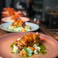 Thoroughly rub the inside of the fillet with chutney, place a small amount of chutney inside, roll it up, and tie it with kitchen twine. Place it in the oven at 356°F and bake for 15 minutes. After that, brush with demi-glace sauce and leave in the oven for another 3 minutes.