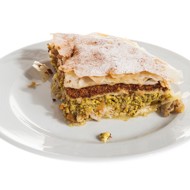 The final layer is almond; repeat the process with a sheet of phyllo and butter. Fold the overhanging edges of the pastry over the pie and brush them with butter. Place a couple more sheets of pastry on top, tuck the edges into the pan, and brush again with butter. Bake at 356°F for 30 minutes.